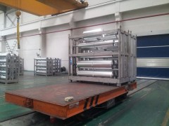 KPDS三相低壓軌道電動(dòng)平車是KPD系列的延伸,也是采用36V低壓軌道供電式電動(dòng)平板車,以軌道滑觸線供電,地面降壓變壓器控制柜將三相交流380V降壓至三相36V,經(jīng)軌道滑觸線饋送給平車,再經(jīng)車載升壓變壓器升壓為三相交流380V,給平車用電機(jī)提供電力。由于不用電纜,安全可靠,不怕砸、不怕?tīng)C、不妨礙交叉運(yùn)輸,易實(shí)現(xiàn)遙控和自動(dòng)化,給廠區(qū)布置帶來(lái)很大的方便,但是該系列電動(dòng)平車的軌道要求比較高,由于采用的是軌道導(dǎo)電,必須對(duì)軌道進(jìn)行絕緣處理,超過(guò)一定的運(yùn)行距離時(shí)軌道應(yīng)加銅牌補(bǔ)償線,用來(lái)補(bǔ)償壓降,運(yùn)行距離比較長(zhǎng)時(shí)還必須增加變壓器的個(gè)數(shù)。